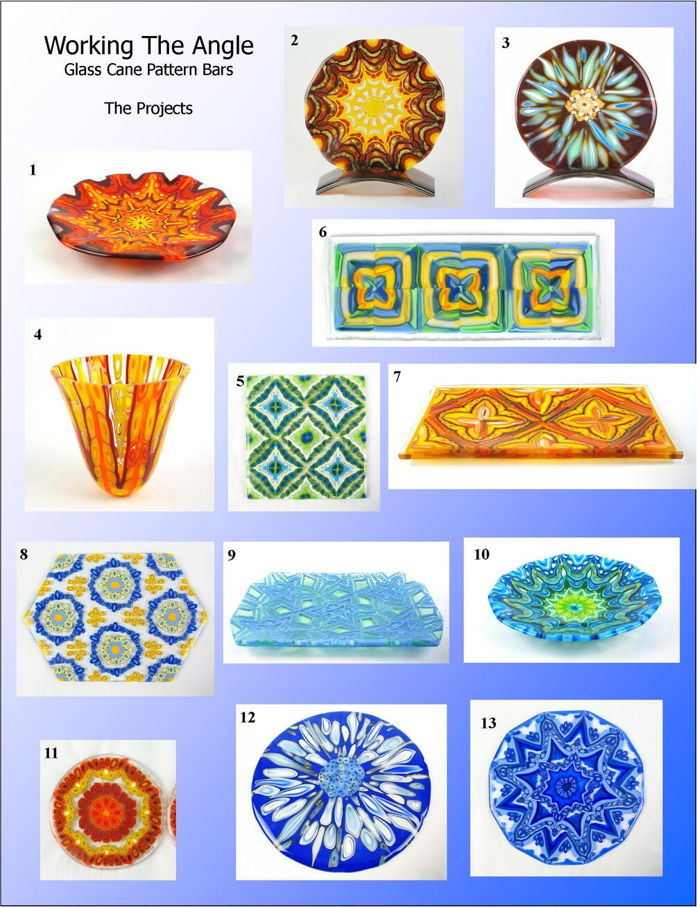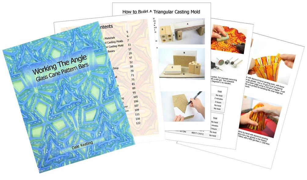 These books include step by step instructions for making 24 different glass cane pattern bar designs. Exploring Pattern focuses on specific stacking techniques in a standard rectangular form and Working The Angle offers instructions for creating medallions and repeating linked patterns using a triangular mold. Both have easy to follow instructions with loads of photos that every level of fuser can follow. A wet saw is required. If you don't have the means to make your own vitrigraph cane, kits can be purchased from www.etsy.com/shop/murriniman . Schedules for both Bullseye glass and System 96 glass are included with both Fahrenheit and Celsius. There are also tips and tricks for cutting on a wet saw and photos of the vitrigraph stacks, vitrigraph firing schedules, descriptions of the setup and techniques used for those who make their own cane.